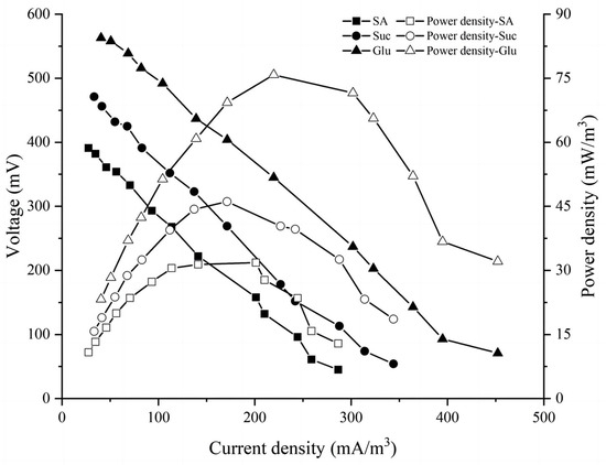 Figure 8 and Figure 9 display DO variation over height in CW-MFC and the polarization and power density curves of the CW-MFC under the influence of different carbon sources. The polarization curves on the left axis all exhibit good fits, indicating stable electricity generation performance for the CW-MFC devices using the three different carbon sources. The highest point on the power density curve on the right axis represents the maximum power density, denoted as Pmax. In this study, the CW-MFC with Glu as the carbon source exhibited a Pmax (maximum power output) of 75.50 mW/m3, significantly higher than that of CW-MFCs with SA or Suc as the co-substrates.