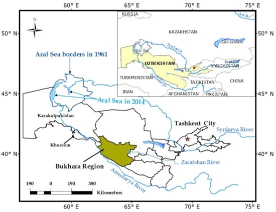 - Administrative-Territorial Division of the Republic of Uzbekistan. Available online: https://dbpedia.org/page/Bukhara_Region (accessed on 21 June 2023).