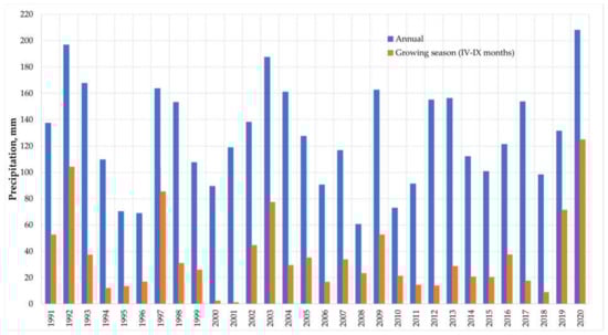 Furthermore, the annual and growing season rainfall values were analyzed for the period of 1991–2020. The annual precipitation is the total amount of precipitation that falls in a year, while the growing season precipitation is the amount of precipitation that falls during the vegetation season, which is typically defined as the period from April to September (Figure 3). The figure shows that the annual precipitation in Bukhara has varied significantly over the past 30 years, from a minimum of 60.5 mm in 2008 to a maximum of 207.9 mm in 2020. The growing season precipitation has also varied significantly, from a minimum of 1.0 mm in 2001 to a maximum of 124.9 mm in 2020. The mean annual precipitation in the region over the past 30 years was 127.58 mm, and the mean growing season precipitation was 35.74 mm. The standard deviation of the annual precipitation was 39.12 mm, and the standard deviation of the growing season precipitation was 29.85 mm. This figure provides a useful overview of the annual and growing season precipitation in Bukhara region over the past 30 years. It can be used to assess the variability of precipitation in the region and to identify trends over time. This information can be used to inform decisions about water management and agricultural practices.