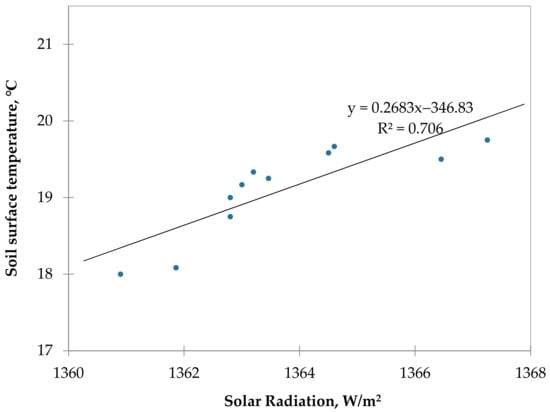 In this study, we investigated solar radiation as a factor contributing to the potential lifting of soil surface temperatures. This involved an assessment of the relationship between solar radiation and the soil surface temperature. Solar radiation is the energy that comes from the sun and reaches the earth’s surface. It is the primary source of heat for the earth’s surface and atmosphere. When solar radiation hits the earth’s surface, it is absorbed by the soil, rocks, and other objects. This absorption of solar radiation causes the earth’s surface to heat up [].