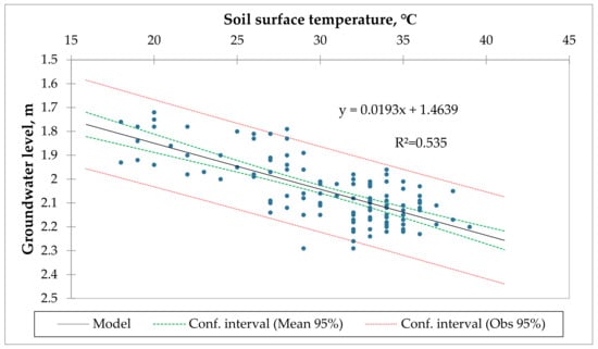Statistical analysis using a linear regression model and ANOVA tests showed that both soil surface temperature and the location of groundwater level measurements were significant factors that affect the groundwater level. The correlation between the soil surface temperature and groundwater level was found to have an R2 value of 0.428 in other research []. Moreover, the correlation between the soil temperature and groundwater level was R2 = 0.49 when the soil temperature was measured at 5 cm, and R2 = 0.59 when the soil temperature was measured at 10 cm [].