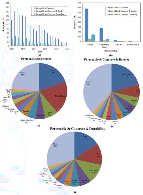 Bibliometric data analysis: (a) annual variation of the published works; (b) type of the published documents; (c–e) geographical distribution of the published works.