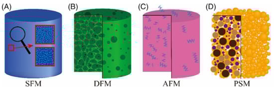 Permeable geopolymers can be prepared using different methods to produce a wide variety of materials with distinctive porous characteristics, and these methods can be categorized into the self-forming method (SFM; Figure 3A), direct foaming method (DFM; Figure 3B), adding filler method (AFM; Figure 3C), and particle stacking method (PSM; Figure 3D) []. Table 2 lists the features of these methods, the general pore structure characteristics of the hardened geopolymers, and their applications.