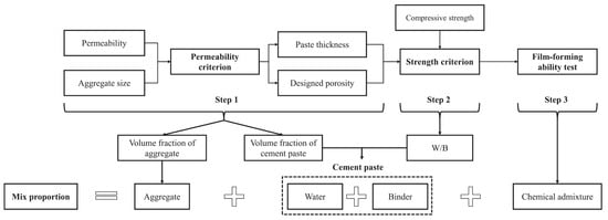 Extensive scientific efforts in the preparation and testing of permeable concrete have generated an acceptable range of values for the water-to-cement ratio and the coarse-aggregate-to-cement ratio, as indicated in Section 2.1. Yet, a standardized method that can be followed to produce universal permeable concrete products for specified applications is still missing [,,,,,]. In this respect, a standard practice to proportionate the used materials, identify the mixing procedure, and determine the optimum curing conditions is missing not only for innovative cement-based materials but also for conventional permeable concrete []. This quest to establish a procedure for the optimization of the mix design is also scarce in the literature. To the knowledge of the authors, only one paper elaborated on the development of a mix design procedure that was recommended for the optimization of the permeability and compressive strength of the permeable concrete []. The optimization procedure comprises three steps that benefit from a set of constitutive relationships, and the performance of a film-forming ability test to allow for the determination of the optimum mix design, as presented in Figure 4 [].