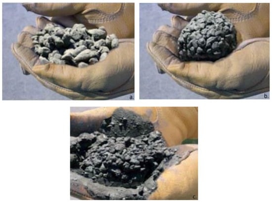 Figure 5. Hand compacting method: (a) scarce water content; (b) adequate water content; (c) excess water content (copyrighted from []). - Slump flow test: This test is used to examine the horizontal flow of the paste (ASTM 143/C143M-12) []. In this respect, the slump is recommended to be adjusted to near zero and less than 5 cm [,,,];