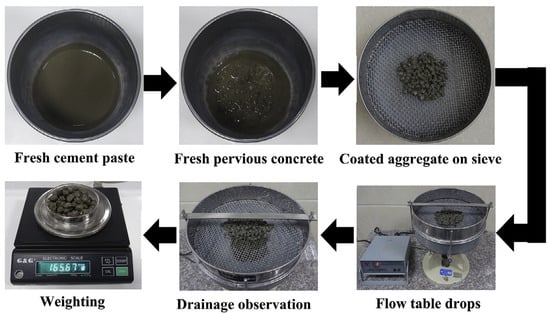 Additionally, the viscosity of the paste, yield stress, and adhesive force of permeable concrete pastes are measured using a rheometer or viscosimeter, and some researchers have studied the effect of these parameters on the compressive strength, thickness of the cement-based material on the aggregates, and on the pore structure of the hardened material [,,,,]. There is an available standardized test to characterize the rheological properties of the paste using a rotational rheometer: ASTM C1749. Furthermore, there are available methods to measure the thickness of the formed paste layer on the aggregate: ideal paste thickness or actual paste thickness methods []. A modification of the actual paste thickness method was proposed using a flow table, and Figure 6 illustrates the procedure for conducting this method []. Another modification of this procedure was proposed by applying vibration or limiting the number of drops to 10 []. Additionally, image processing can be used to calculate the thickness.