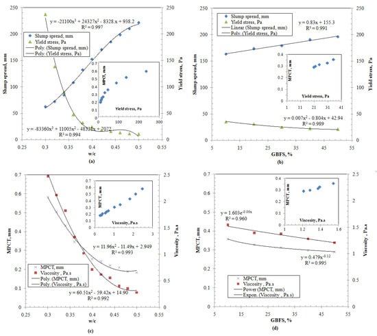 Figure 7a–d illustrate the effect of the variation of the conventional cement mix design on the flowability, i.e., slump spread, yield stress, viscosity, and the maximum paste coating thickness on the aggregates []. Figure 7a,c show the effect of the variation of the w/c ratio in a simple permeable concrete samples composed of 100% cement as binder on these properties. The general behavioral trend can easily be deduced in these simple systems, where the flowability (i.e., slump spread) increases by increasing the w/c ratio and the rest of the properties display decreasing behaviors []. The behavior of these properties can be described using polynomial equations with correlation coefficients larger than 0.99. The effect of the variation of the SCM incorporation percentage in the permeable concrete (i.e., granulated blast furnace slag (GBFS)) on the same properties has a limited effect compared to that of the w/c ratio, shown in Figure 7a–c, as reported by Xie et. al. []. These studied samples were prepared at a lower w/c ratio (i.e., 0.28) and contained superplasticizer at a dosage equal to 0.4%. For those samples, the flowability slightly increased with the increased incorporation of the GBFS up to 50% and with the rest of the properties being reduced. The increasing correlation between the thickness of the cement-based material on the aggregates and the yield stress and the viscosity of the paste were confirmed for all of the studied mix designs (Figure 7a–d insert) [,,].
