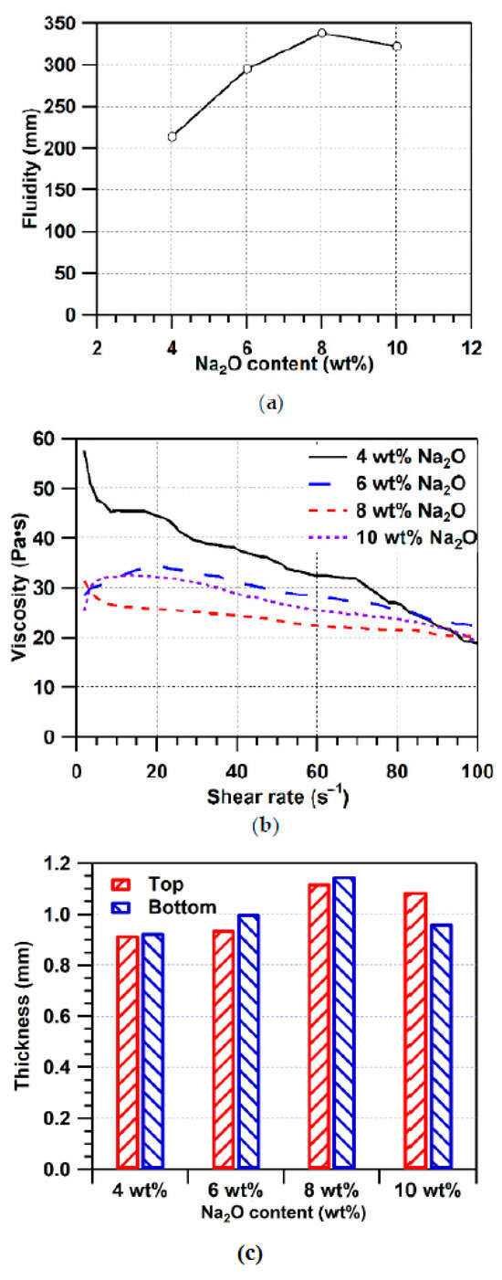 The effect of the variation of the sodium content in the alkali activator of the mix design of the permeable geopolymer concrete on the flowability of the paste, viscosity, shear stress, and the thickness of the hardened geopolymer coat was studied by Geng et al. []. The studied samples were BFS-based geopolymers prepared with water glass and sodium hydroxide in the presence of a retarder and limestone as coarse aggregate. Figure 8a–c illustrate the results in which the flowability, viscosity, and coat thickness increased with the increase in the Na2O content up to 8%; then, the values of these properties decline. The increased behavior of the flowability and reduced behavior of the viscosity and shear stress of the paste is attributed to the formation on an electric double layer with repulsive forces on the precursor particles (i.e., BFS) due to the adsorption of activator silicate anions (Figure 8a,b). A further increase in the amount of Na2O is claimed to lead to the enhanced formation of C-S-H gel that reduces the flowability and increases the viscosity and shear stress []. The variation of the geopolymeric coat’s thickness on the aggregates (Figure 8c) shows a similar trend to that of the flowability []. The effect of the admixture on the rheological properties of the geopolymeric paste is an active area of study that aims to identify the effect of various admixtures on the workability of the paste. A study was devoted to investigating the effect of the water-reducing admixture and the molar strength of the alkali activator on the rheological properties of the fly-ash-based geopolymer paste []. The studied systems included both fine and coarse aggregates, as well as the alkali activator composed of a mixture of sodium hydroxide and sodium silicate. The results revealed that there was a critical molar strength (i.e., 4 M) beyond which the plasticizer and the superplasticizer had contradicting effects on the plastic viscosity, slump spread, and yield stress of the studied samples. In this respect, above this threshold value (i.e., <4 and =10 M), a clear decrease in the slump spread and increase in the yield stress and viscosity were recorded []. This study indicates that the employment of a lignin-based plasticizer leads to a better performance in terms of the paste’s workability over that of a polycarboxylic–ether-based high-range water reducer.