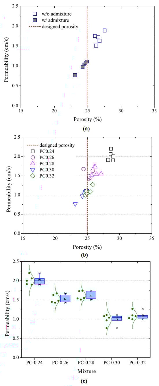 Effects of the mix design on the hydraulic properties of the hardened permeable concrete of different water to cement ration PC-X (X = 0.24; 0.26; 0.28; 0.3; 0.32): (a) effect of the incorporation of the admixture; (b) effect of the w/c ratio; (c) statistical distribution of the permeability at different w/c ratios (copyrighted from []).