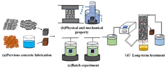 Experimental testing scheme for potential application of permeable materials in pollutant removal: (a) preparation of the monolith sample; (b) physical and mechanical characterizations; (c) static removal test; (d) dynamic removal test (copyrighted from []).