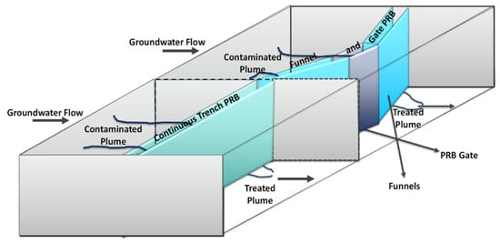 The remediation of contaminated ground water is an essential activity to ensure the sustainability of this source of water, and both active and passive ground water remediation technologies have been implemented. Specifically, passive remediation via permeable reactive barrier have been applied since 1995.The basic idea behind this technology is to install a porous reactive material below the ground surface in the down gradient direction of the plume of the contaminated ground water, which allows for its passage under a natural hydraulic gradient [,,,,,,,]. Figure 11 illustrates the configuration of the funnel and gates (F&GPRB) and the continuous trench (CPRB) installation of the permeable reactive barrier []. This technology provides several economic and technical benefits compared to active ex situ groundwater remediation technology, i.e., pump and treat. These benefits include the following [,,,]: