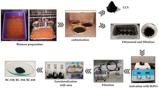 Afterward, a portion of the biochar was taken, washed, and dried in an oven at 100 °C for 2 h. Then, the bioadsorbent was packaged and labeled as unmodified biochar (CCS) to be used as a control. The remaining portion was mixed with distilled water in a 1:3 ratio, shaken, and placed in an ultrasonic bath for one minute; then, this material was vacuum filtered and dried for two hours in an oven at 100 °C. Subsequently, the dried biomaterial is mixed in a beaker with a 50% phosphoric acid solution, with a ratio of 1 g per each 5 mL of solution, using constant stirring at 100 °C for 3 h []. Afterward, this biomaterial was washed, vacuum filtered, and dried to perform urea functionalization. For this chemical modification, the biomaterials were mixed with urea solutions at three different concentrations: 1 M, 3 M, and 6 M in a ratio of 1 g:5 mL, placed in a shaker for 18 h, then vacuum filtered and dried in an oven at 100 °C, as shown in Figure 1. Adding urea to sawdust during the functionalization process significantly impacts its ability to adsorb contaminants []. This is because urea chemically interacts with the surface of the sawdust particles, modifying their characteristics, such as their charge and affinity for specific pollutants []. The concentration of urea used can also affect the structure and porosity of the material, which directly affects its ability to interact with contaminants in a solution []. By incorporating urea, the adsorption capacity can be increased, and the selectivity of the adsorbent towards specific pollutants can be improved [].