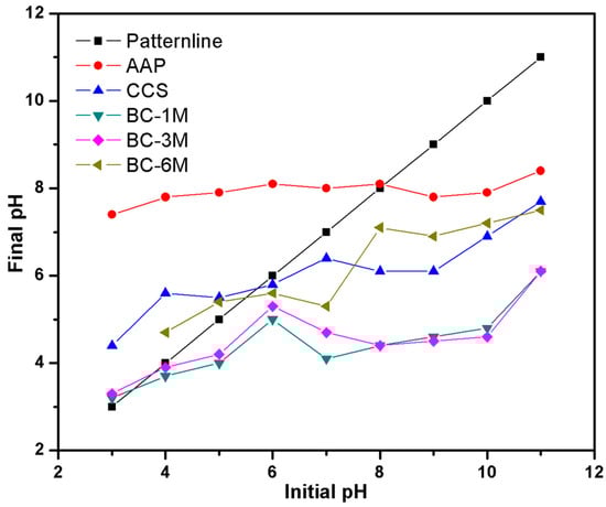 Evaluation of the pHpzc of AAP, CCS, BC-1M, BC-3M, and BC-6M.