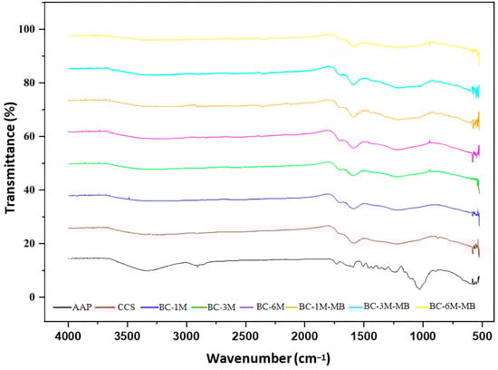 FTIR analysis of the adsorbents evaluated with the methylene blue test (after and before the adsorption process) (BC-1M-MB, BC-3M-MB, and BC-6M-MB).