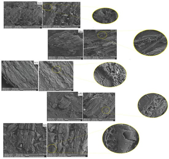 In the SEM images of the biomaterials modified with urea (Figure 4c–e), it is evident that the effect of ultrasound substantially improved the presence of micropores, eliminating traces of ash and obtaining cleaner surfaces. From this, it can be ensured that the time in the ultrasound manages to open the pores clogged by-products of the carbonization process, increasing the porosity of the materials. For this reason, it can be ensured that it is not enough to carbonize the biomass without subsequent processes; in this case, ultrasonic washing, proposed by Sajjadi et al. [], stands out, who compared commercial biochar, made from pine softwood without subsequent processes, with the same type of sonicated biochar and evaluated the difference of biochar’s with SEM micrographs, finding results similar to those of the present study, because in the biochar’s sonicated for 20, 40, and 60 s, open pores were observed. No lumps were visualized, while in the biochar without time in the ultrasound, they were observed the opposite.