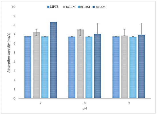 The three levels of pH variation analyzed were 7, 8, and 9, which are above pHpzc. The adsorbent dose was 0.035 g, and the contaminant concentration was 40 mg/L. Considering the replicates, the average adsorption capacity was calculated, and pH 7 was identified as the optimum pH because 75% of the evaluated biomaterials had the highest adsorption capacity at this pH. Figure 5 shows the effect of the solution’s pH on methylene blue’s adsorption capacity.