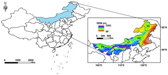 The IM is located in the north of China, spanning across Northeast, North China, and Northwest. The topography of the IM is characterized by a west-high and east-low terrain, with higher elevations in the south and lower elevations in the north. The region falls within the temperate continental zone, featuring unfavorable water and heat conditions along with scarce precipitation. The IM lies in the transition zone of monsoonal circulation, with precipitation decreasing from southeast to northwest. The temperature gradually increases from the Greater Khingan Mountains towards the southeast and southwest directions. The main precipitation occurs in July and August, with an annual average precipitation ranging from 50 to 450 mm, and an average annual temperature ranging from −4 °C to 9.2 °C []. Furthermore, the IM is home to the largest desert and grassland area in China, characterized by high ecological vulnerability. Drought has greatly constrained local socio-economic development. Based on different vegetation types, this study divides the IM into three parts: Desert Vegetation zone (DV), Grassland Vegetation zone (GV), and Forest Vegetation zone (FV), as shown in Figure 1.