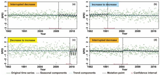 Segmented trend and mutation identification of SPEI sequence in the IM and its subregions based on the BFAST. (a–d) represent segmented trend and mutation on the IM, DV, FV, and GV, respectively.