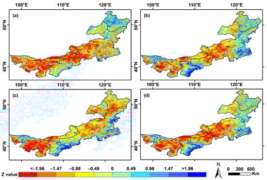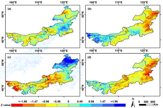Spatial distribution of the PTIM-based gridded trend characteristics of VHI on seasonal scales in the IM from 1982 to 2020. (a–d) represent the spatial distribution of Z values on spring, summer, autumn and growing season, respectively.