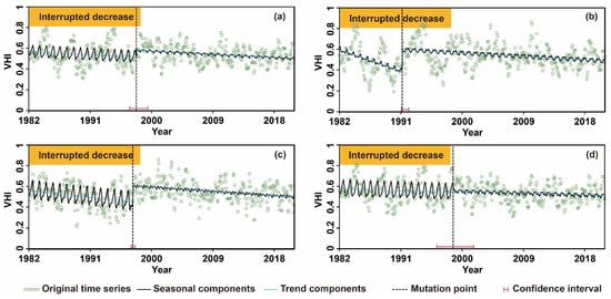 Segmented trend and mutation identification of VHI sequence in the IM and its subregions based on the BFAST. (a–d) represent segmented trend and mutation on the IM, DV, FV, and GV, respectively.