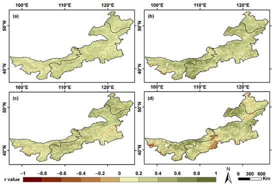Correlations of SPEI with VHI in different time scales. (a–d) represent the spatial distribution of r values between 1-month SPEI, 3-month SPEI, 6-month SPEI, 12-month SPEI and VHI, respectively.