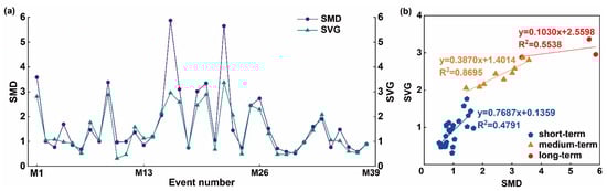 Based on the identification of meteorological drought events in the IM during this period, we analyzed the vegetation growth variations within each drought event, as shown in Figure 8. As depicted in Figure 8a, in 38 meteorological drought events, SMD and SVG exhibited similar patterns of change. Additionally, their values show minimal differences in each event. The SMD and SVG exhibited a high level of consistency, with an r of 0.898 (p < 0.01). This result strongly demonstrated the correlation between meteorological drought and vegetation growth, suggesting that meteorological drought events may directly impact vegetation growth. To further investigate the influence of meteorological drought events on vegetation growth, we categorized them into three types: short-term (lasting 1–3 months), medium-term (lasting 4–6 months), and long-term (lasting more than 6 months), and analyzed the distribution of SMD and SVG under different types of meteorological drought events (Figure 8b). The SVG responded more intensely to short-term meteorological drought events, with a slope of 0.7687. As the duration of meteorological drought events increased, the response of SVG gradually leveled off. For medium-term and long-term meteorological drought events, the slopes obtained from the fitting of SVG with SMD were 0.3870 and 0.1030, respectively.