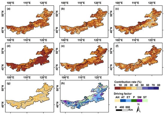 Contribution rate of climate factors to vegetation growth in the IM. (a–f) denote the contribution rate of AH, AT, ET, P, SM and ST, respectively, (g) denotes the maximum contribution rate, and (h) denotes the key driving factors.