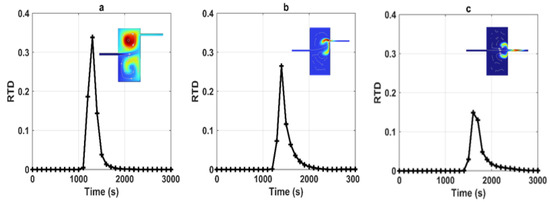 RTDs corresponding to various geometries involving the variation of distances between inlets and outlets, as well as symmetry alterations. Within this figure, (a) corresponds to L = 20 m, (b) represents L = 10 m up, and (c) signifies L = L (symmetric) (The concentration field shown in the figures corresponds to the peak).