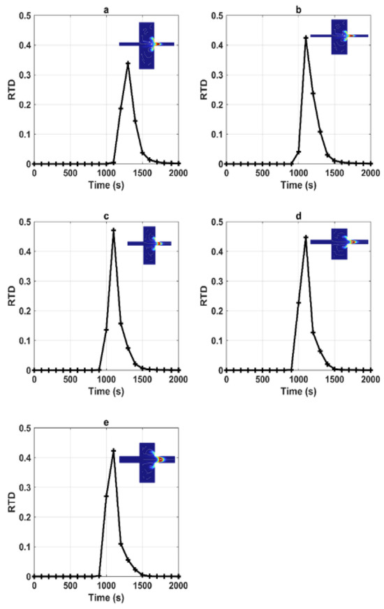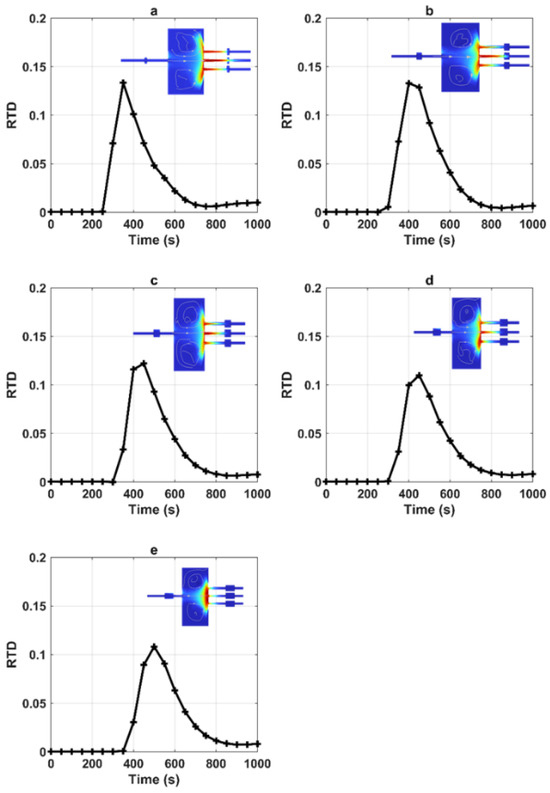 RTDs corresponding to various geometries involving the pool sizes. Within this figure, (a) corresponds to LP = 2 m, (b) represents LP = 4 m up, (c) signifies LP = 6 m, (d) indicates L = 8 m down, and (e) corresponds to L = 10 m (the concentration field shown in the figures corresponds to the peak).