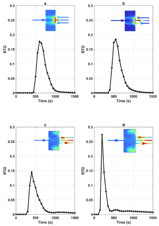 RTDs corresponding to various geometries involving the pool positions: (a) corresponds to L-L-L, (b) represents L-L-2L-3L, (c) 2L-L-2L-3L, and (d) 3L-L-2L-3L (the concentration field shown in the figures corresponds to the peak).