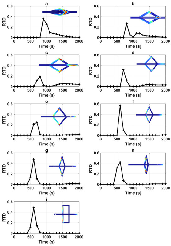 RTDs corresponding to various geometries involving angle of connection (a) corresponding to alpha = 10, (b) alpha = 20, (c) alpha = 30, (d) alpha = 40, (e) alpha = 50; (f) alpha = 60, (g) alpha = 70, (h) alpha = 80, and (i) alpha = 90 (the concentration field shown in each figures corresponds to the peak).