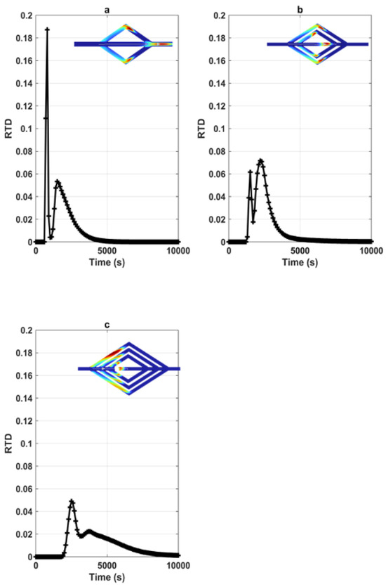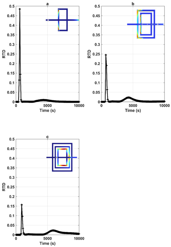 RTDs corresponding to various geometries involving several branches for alpha = 90 within figure: (a) corresponds to n = 1, (b) illustrates n = 2 and (c) shows n = 3 (the concentration field shown in the figures corresponds to the concentration peak).