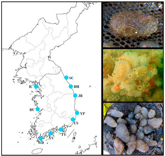 Overview of Ascidiella aspersa specimens collected from the Korean coast. Please see Table 1 for detailed information.