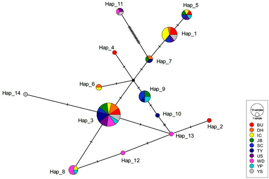 Yeosu had the highest Hd of 0.8571 ± 0.1083 and nucleotide diversity (π) of 0.0102 ± 0.0061, whereas the Tongyeong (TY) population exhibited the lowest haplotype and nucleotide diversities (0.6429 ± 0.1841 and 0.0022 ± 0.0017, respectively) (Table 4).