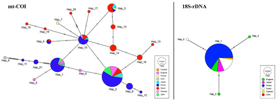 TCS networks of Ascidiella aspersa mitochondrial cytochrome oxidase I (mt-COI) and 18S-rDNA haplotypes in the world population. Areas of circles are proportional to the frequency of each haplotype in the dataset, and differing shading indicates the nine different geographic regions.