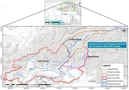 Therefore, this study covers the analysis of three major western river sub-basins of the UIB: the Swat River basin, the Chitral River Basin, and the Kabul River basin (Figure 1). The Swat and the Chitral Rivers are the indirect and major tributaries of the Kabul River. The combined river basin in this study is known as the Great Kabul River Basin, with a total area of 94,552.86 km2. A brief description of all the sub-basins is given below.