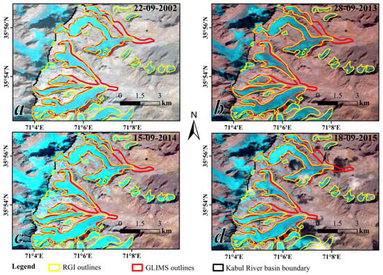 To evaluate the accuracy of each glacier inventory, Landsat images have also been used. Landsat 7 ETM+ imageries used in the RGI database (1999–2003), together with recent imageries (Landsat 8 OLI/ TIRS) for different years, have been used for critical visual assessment. For this purpose, high-quality Landsat images with less than 10% cloud cover (except for one image for the Swat River basin with a cloud cover of 10.86%) were acquired for different years for the months with the least seasonal snow cover: July, August, and September. For the Chitral River Basin, Landsat images from the same year with less than 10% cloud cover are not available for the entire basin; therefore, images from different years with less than 10% cloud cover are downloaded and mosaicked to investigate different parts of the basin.