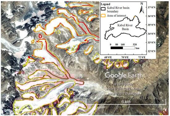 Based on the available studies, the main problem associated with NDSI and band ratio methods is the selection of the appropriate threshold required for the post-processing of images. The selection of improper thresholds may result in the inaccurate boundaries of snow and glaciers. On the other hand, visual interpretation technique greatly depends on the availability of high-quality and long time series satellite (Landsat) images. The Landsat images with minimum cloud cover help in identifying accurate glacier outlines. Fortunately, a set of 12 high-quality Landsat images for a late ablation period over a multiyear period covers the study area. Therefore, visual inspection has successfully been carried out in the current study, covering the entire areas of the Kabul, the Chitral, and the Swat River basins.