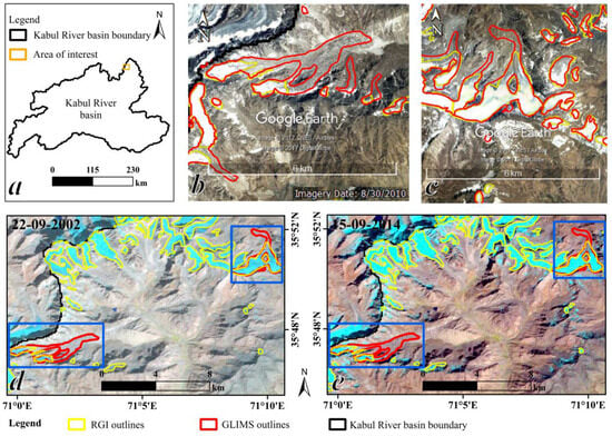 The locations of glaciers in the basin are shown in (a). Comparison of Landsat images for the dates 22-09-2002 and 15-09-2014 (d,e) with Google Earth images (b,c) of 08/30/2010 providing evidence that RGI has underestimated the glaciers (see within blue rectangles) by not considering debris-covered ice. However, GLIMS is showing consistency with Google Earth images for these medium glaciers.