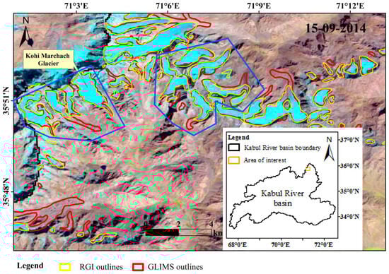 Google Earth image of 08/30/2010. The inset shows the Kabul River basin boundary along with the area of interest. Red represents the GLIMS outlines, and yellow represents the RGI outlines. The image clearly shows that RGI has underestimated the glacier areas by ignoring debris-covered ice.