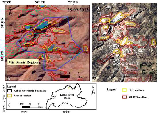 The glacierized area for small glaciers is estimated to be 32.54 km2 and 61.52 km2 by RGI and GLIMS data, respectively. Visual inspection indicates that the glacier outlines for small glaciers provided by the two glacier inventories along the boundary shared by Badakhshan and Nuristan near the Kohe–Khrebek mountain range are approximately the same (see glaciers in blue polygons in Figure 5 and Figure 6). However, the major difference exists in the glaciated area in the region of the Mir Samir and the divide between the two provinces of Afghanistan, namely Badakhshan and Panjshair. One such example is shown in Figure 7. In these regions, most of the small glaciers represented by GLIMS are classified as very small glaciers by RGI, ignoring the debris cover, resulting in the underestimation of the glaciated area. Compared to RGI, GLIMS shows a good match with the latest Google Earth image for small glaciers (Figure 7b).