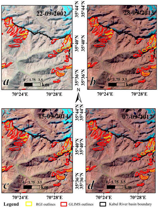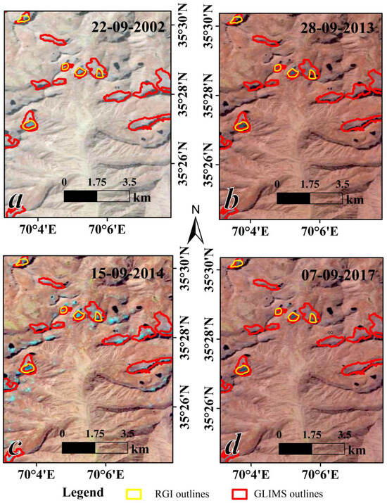 Landsat images obtained for 22-09-2002 (a), 28-09-2013 (b), 15-09-2014 (c), and 07-09-2017 (d) confirming that GLIMS has digitized the glacier boundaries for most of the very small and very very small glaciers, which are neither seasonal snow nor debris-covered ice.