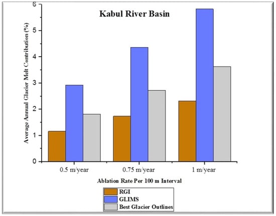 - In the last step, the importance of the selected/derived best glacier inventories has been assessed by estimating glacier-melt contributions to flows of each basin. The glacier-melt contribution has been estimated using the method proposed by []. For this study, an equilibrium line altitude (ELA) of 5000 m.a.s.l based on the study conducted by [] and [] for the HKH region has been used. The ablation zone extracted from DEM (SRTM 90 m) has been subdivided into 100 m elevation bands. Ablation rates of 0.5 m/year, 0.75 m/year, and 1 m/year for 100 m intervals suggested by [] have been used for annual glacier-melt estimation.