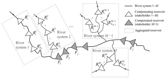 The inflow of the leading reservoir (F1) in the downstream cascade and the lateral inflow of downstream reservoir Fj are influenced by the streamflow regulation of the upstream reservoir system. On the one hand, when the upstream reservoir system conducts joint operations for complementing the downstream reservoirs, synergistic revenue will be generated downstream. On the other hand, deviation from the individual optimal operation strategy of upstream reservoirs owing to joint operation will reduce revenue, corresponding to operation cost. Moreover, revenue and cost could be totally different under various combinational scenarios of the upstream stakeholders. Therefore, this study focused on evaluating the synergistic revenue and operation cost corresponding to joint scenarios of individual and combinational stakeholders. An equivalent aggregated reservoir model based on the topology of the river system is proposed, which aggregates the upstream compensating reservoirs into a group of M aggregated reservoirs.
