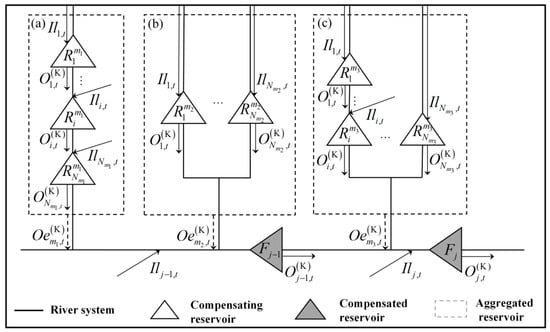 Addressing the influence of the operation of upstream reservoirs on streamflow, the concept of an equivalent aggregated reservoir is proposed, which aggregates the storage and inflow of the upstream reservoirs to simulate the overall influence of the entire system with their internal regulation effect simplified [,]. The equivalent aggregated reservoirs model can be applied to cascade, parallel, and mixed reservoirs by ignoring complex inter-reservoir regulation processes, such that the influence of all reservoirs in a given upstream river system can be represented as a singular reservoir operation. Consequently, the inflow of the compensated reservoirs can be derived either with or without the joint operation of the aggregated reservoirs. A schematic depicting various forms of aggregated reservoirs is shown in Figure 3.