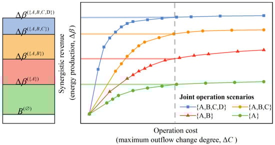 The analysis in Section 3.2 shows that when the upstream compensating reservoirs participate in joint operation to increase the overall revenue of middle and downstream compensated reservoirs, the incremental synergistic revenues in energy production decrease as the number of compensating reservoirs increases. Therefore, when considering operating the entire reservoir system under a joint operation, the compensating reservoirs that achieve the highest synergistic revenue in energy production under a certain given cost should be selected preferentially by the downstream compensated reservoirs for realizing cooperation.