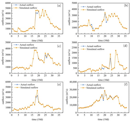 Simulated outflow process of the reservoirs in comparison with the actual outflow for aggregated reservoirs: (a) A, (b) B, (c) C, (d) D, (e) E, and (f) the entire system.