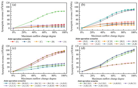 Synergistic revenue–cost relationships under different combinational scenarios: (a) singular aggregated reservoir, (b) two aggregated reservoirs, (c) three aggregated reservoirs, and (d) four and five aggregated reservoirs.