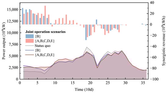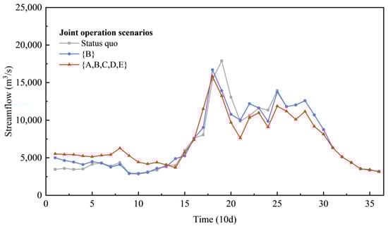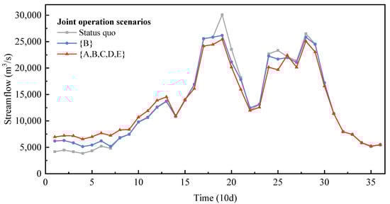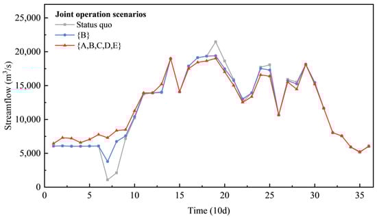 The synergistic revenue in energy production generated from the joint operation is mainly produced in the preflood season, as seen in Figure 8. This is because joint operation through the complementarity provided by the aggregated reservoirs redistributes the temporal distribution of streamflow processes, which homogenizes the inflow process of the compensated reservoirs. The homogenization (shown in Figure 9) enhances the water head and the power release water in the dry season and reduces spillage in the flood season, which improves the overall efficiency in the use of water resources. The results show that current inflow during the dry season (periods 1–14) is increased by 9.24% and 24.89% under joint operation scenario {B} and scenario {A,B,C,D,E}, respectively; correspondingly, the water head of F5 is increased by 2.51 and 2.86 m (Figure 10), and the power release of F6 is increased by 7.91% and 19.98%, respectively (Figure 11). Figure 9 also shows that current inflow in the flood season (periods 15–31) is reduced by 2.67% and 7.20% under joint operation scenario {B} and scenario {A,B,C,D,E}, respectively, resulting in a corresponding reduction in spillage by 4.40 × 109 and 1.17 × 1010 m3, accounting for 6.70% and 17.76% of the total spillage, respectively. Consequently, the synergistic revenue in energy production of the compensated reservoirs system is improved by 80.41 × 108 kWh (2.48%) and 105.04 × 108 kWh (3.24%).