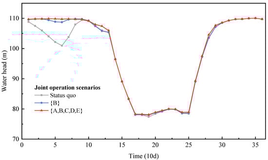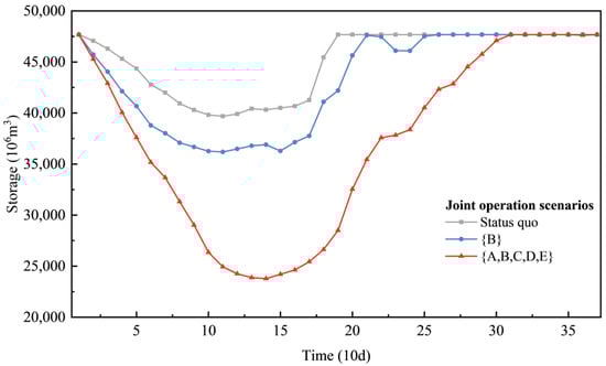 Figure 13 also shows that the aggregated reservoirs tend to release more water during the dry season when complementing the downstream reservoirs; thus, the total storage is further reduced with the increase in the number of aggregated reservoirs. The minimum storage of the aggregated reservoirs under scenario {B} and scenario {A,B,C,D,E} decreases by 3.49 × 109 and 1.59 × 1010 m3. Moreover, the postponed refilling of the aggregated reservoirs during the late flood season homogenizes the outflow process temporally, thereby increasing the dry season inflow and the water head of the compensated reservoirs and also providing additional water for their refilling operations.
